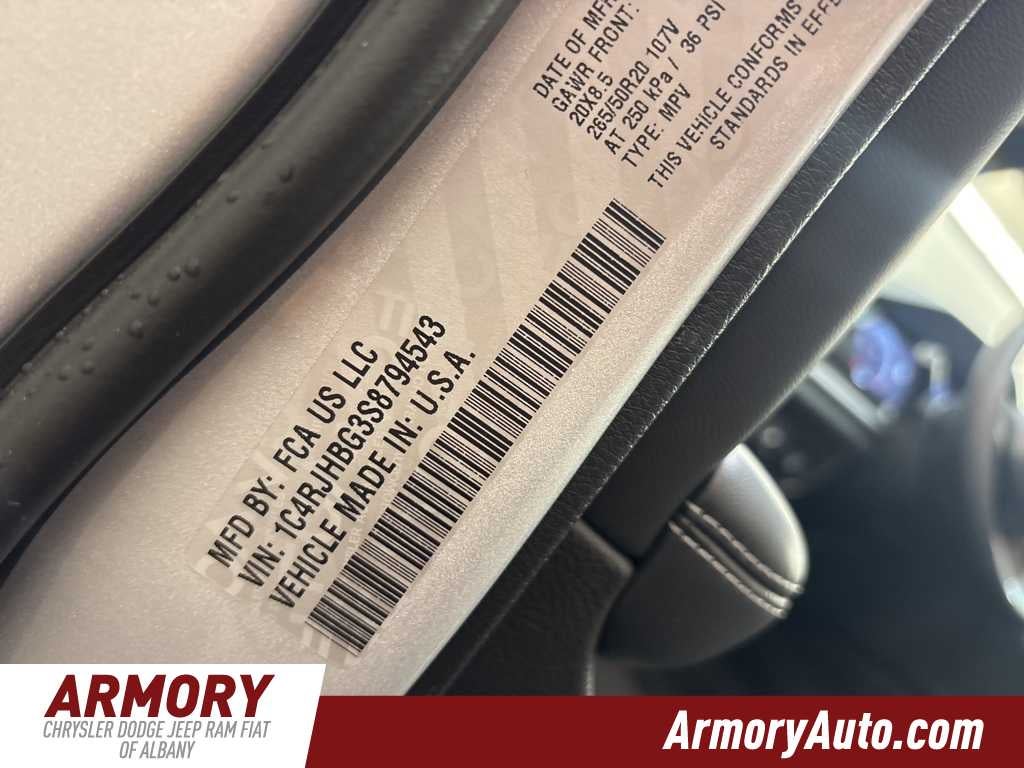 Grand Cherokee Limited is nicely equipped with Blackout Model (Black Painted Roof, Delete Limited Badge, Dual-Pane Panoramic Sunroof, Gloss Black Exterior Accents, and Wheels: 20 x 8.5 Black Painted Aluminum), Quick Order Package 23E, 4-Wheel Disc Brakes, 6 Speakers, ABS brakes, Active Noise Control System, Air Conditioning, Alloy wheels, AM/FM radio: SiriusXM with 360L, Anti-whiplash front head restraints, Audio memory, Auto High-beam Headlights, Automatic temperature control, Brake assist, Bumpers: body-color, Capri Leatherette Seats, Compass, Delay-off headlights, Driver door bin, Driver vanity mirror, Dual front impact airbags, Dual front side impact airbags, Electronic Stability Control, Emergency communication system, Four wheel independent suspension, Front anti-roll bar, Front Bucket Seats, Front Center Armrest w/Storage, Front dual zone A/C, Front fog lights, Front License Plate Bracket, Front reading lights, Fully automatic headlights, Garage door transmitter, Heated door mirrors, Heated front seats, Heated rear seats, Heated steering wheel, Illuminated entry, Knee airbag, Low tire pressure warning, Memory seat, Model Year Tracking, Navigation System, Normal Duty Suspension, Occupant sensing airbag, Outside temperature display, Overhead airbag, Overhead console, Panic alarm, ParkView Rear Back-Up Camera, Passenger door bin, Passenger vanity mirror, Power door mirrors, Power driver seat, Power Liftgate, Power passenger seat, Power steering, Power windows, Radio data system, Radio: Uconnect 5 Nav with 10.1 Display, Rear anti-roll bar, Rear reading lights, Rear window defroster, Rear window wiper, Remote keyless entry, Security system, Speed control, Speed-Sensitive Wipers, Split folding rear seat, Spoiler, Steering wheel mounted audio controls, Tachometer, Telescoping steering wheel, Tilt steering wheel, Traction control, Trip computer, Turn signal indicator mirrors, Variably intermittent wipers, Voltmeter, and Wheels: 18 x 8 Polished/Painted Aluminum.