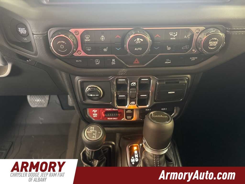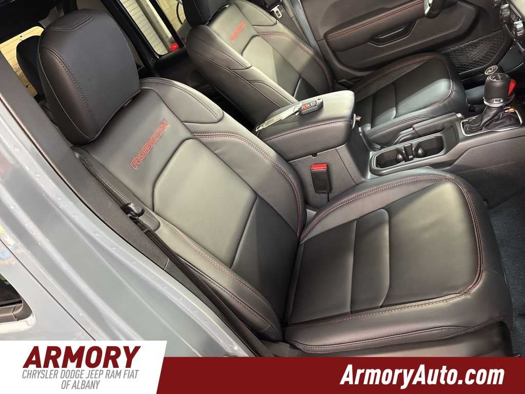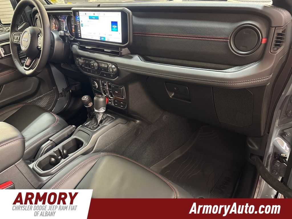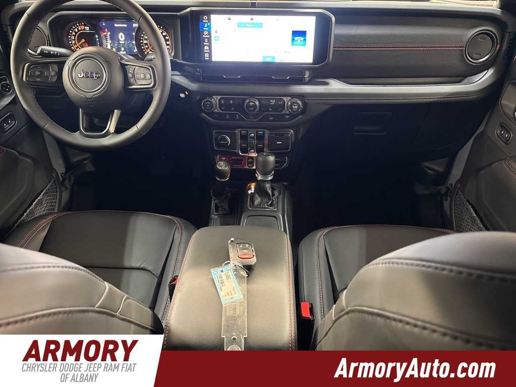 Gladiator Rubicon is nicely equipped with Convenience Group (Heated Front Seats, Heated Steering Wheel, Remote Start System, and Universal Garage Door Opener), Quick Order Package 24R Rubicon, Steel Bumper Group (Steel Front Bumper), Steel Power Dome Hood Package (Power Dome Dual Vented Hood), 110 Mph Vehicle Max Speed Calibration, 12.3 Touchscreen Display, 4-Wheel Disc Brakes, 4.10 Rear Axle Ratio, 4G LTE Wi-Fi Hot Spot, 8 Speakers, ABS brakes, Air Conditioning, Alexa Built-in, Alloy wheels, Alpine Premium Audio System, AM/FM radio: SiriusXM with 360L, Apple CarPlay, Apple CarPlay/Android Auto, Automatic temperature control, Black 3-Piece Hard Top, Body Color Rubicon Highline Flare, Brake assist, Cloth Low-Back Bucket Seats, Compass, Connectivity - US/Canada, Delay-off headlights, Driver door bin, Driver vanity mirror, Dual front impact airbags, Dual front side impact airbags, Electronic Stability Control, Emergency communication system: Jeep Connect, Freedom Panel Storage Bag, Front anti-roll bar, Front Bucket Seats, Front Center Armrest w/Storage, Front dual zone A/C, Front fog lights, Front License Plate Bracket, Front reading lights, Fully automatic headlights, Google Android Auto, Heated door mirrors, Illuminated entry, Integrated roll-over protection, Jeep Trail Rated Kit, Low tire pressure warning, Manufacturers Statement of Origin, MOPAR All-Weather Slush Mats, MOPAR Doors Off Mirror Kit, MOPAR Hard Tri-Fold Tonneau Cover, MOPAR Satin Black Grille with Satin Black Ring, MOPAR Spray in Bedliner, MyFlexCare Service Plan, Occupant sensing airbag, Outside temperature display, Overhead airbag, Panic alarm, Passenger door bin, Passenger vanity mirror, Performance Suspension, Power door mirrors, Power steering, Power windows, Radio data system, Radio: Uconnect 5 with 12.3 Display, Rear anti-roll bar, Rear reading lights, Rear Sliding Window, Rear Window Defroster, Remote keyless entry, Security system, Speed control, Split folding rear seat, Steering wheel mounted audio controls, Tachometer, Telescoping steering wheel, Tilt steering wheel, Traction control, Trip computer, USB Host Flip, Variably intermittent wipers, Voltmeter, Wheels: 17 x 7.5 Machined with Black Pockets, and Wheels: 17 x 7.5 Machined/Painted Black.