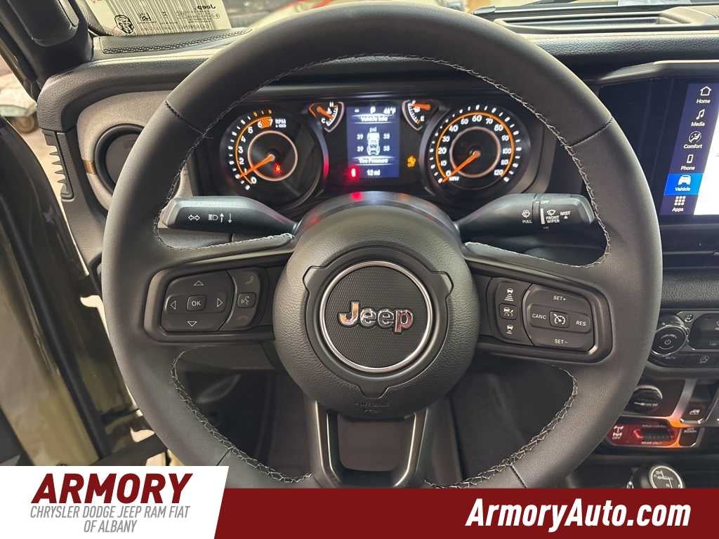 Wrangler Willys is nicely equipped with Quick Order Package 22W Willys (4-Wheel Drive Swing Gate Decal, 7 and 4 Pin Wiring Harness, Advanced Brake Assist, Automatic Headlamps, Auxiliary Switches, Black Grille with Gloss Black Rings, Class II Receiver Hitch, Conventional Differential Front Axle, Corning Gorilla Glass, Dana M210 Wide HD Tube Front Axle, Dana M220 Wide Rear Axle, Daytime Running Lamps LED Accents, Deep Tint Sunscreen Windows, E-Locker Rear Axle, Enhanced Adaptive Cruise Control, Front LED Fog Lamps, Full Speed Forward Collision Warning Plus, Injection Molded Black Rear Bumper, LED Premium Reflector Headlamps, Mold in Color Bumper with Gloss Black, Molded in Color Rubicon Highline Flare, MOPAR All-Weather Floor Mats, Off-Road Plus Mode, Power Heated Mirrors, Premium Wrapped Steering Wheel, Security Alarm, Sun Visors with Illuminated Vanity Mirrors, Wheels: 17 x 7.5 Painted Black, Willys Suspension, and Willys Hood Decal), Steel Power Dome Hood Package (Power Dome Dual Vented Hood), 12.3 Touchscreen Display, 4-Wheel Disc Brakes, 4G LTE Wi-Fi Hot Spot, 8 Speakers, ABS brakes, Air Conditioning, Alpine Premium Audio System, AM/FM radio: SiriusXM with 360L, Apple CarPlay, Apple CarPlay/Android Auto, Aux Battery, Brake assist, Cloth Low-Back Bucket Seats, Compass, Connectivity - US/Canada, Delay-off headlights, Driver door bin, Driver vanity mirror, Dual front impact airbags, Dual front side impact airbags, Electronic Stability Control, For More Info, Call 800-643-2112, Front anti-roll bar, Front Bucket Seats, Front Center Armrest w/Storage, Front fog lights, Front reading lights, Google Android Auto, Illuminated entry, Integrated Center Stack Radio, Integrated roll-over protection, Jeep Trail Rated Kit, Low tire pressure warning, Myflexcare Service Plan, Non-Lock Fuel Cap Without Discriminator, Normal Duty Suspension, Occupant sensing airbag, Outside temperature display, Overhead airbag, Panic alarm, ParkView Rear Back-Up Camera, Passenger door bin, Passenger vanity mirror, Power steering, Power windows, Radio data system, Radio: Uconnect 5 with 12.3 Display, Rear anti-roll bar, Rear reading lights, Remote keyless entry, SiriusXM Radio Service, SiriusXM with 360L, Speed control, Steering wheel mounted audio controls, Stop-Start Dual Battery System, Tachometer, Telescoping steering wheel, Tilt steering wheel, Traction control, Trip computer, Variably intermittent wipers, and Wheels: 17 x 7.5 Black Steel Styled. Price includes: $1000 - 2026 National Select Inventory Bonus Cash . Exp. 01/04/2027